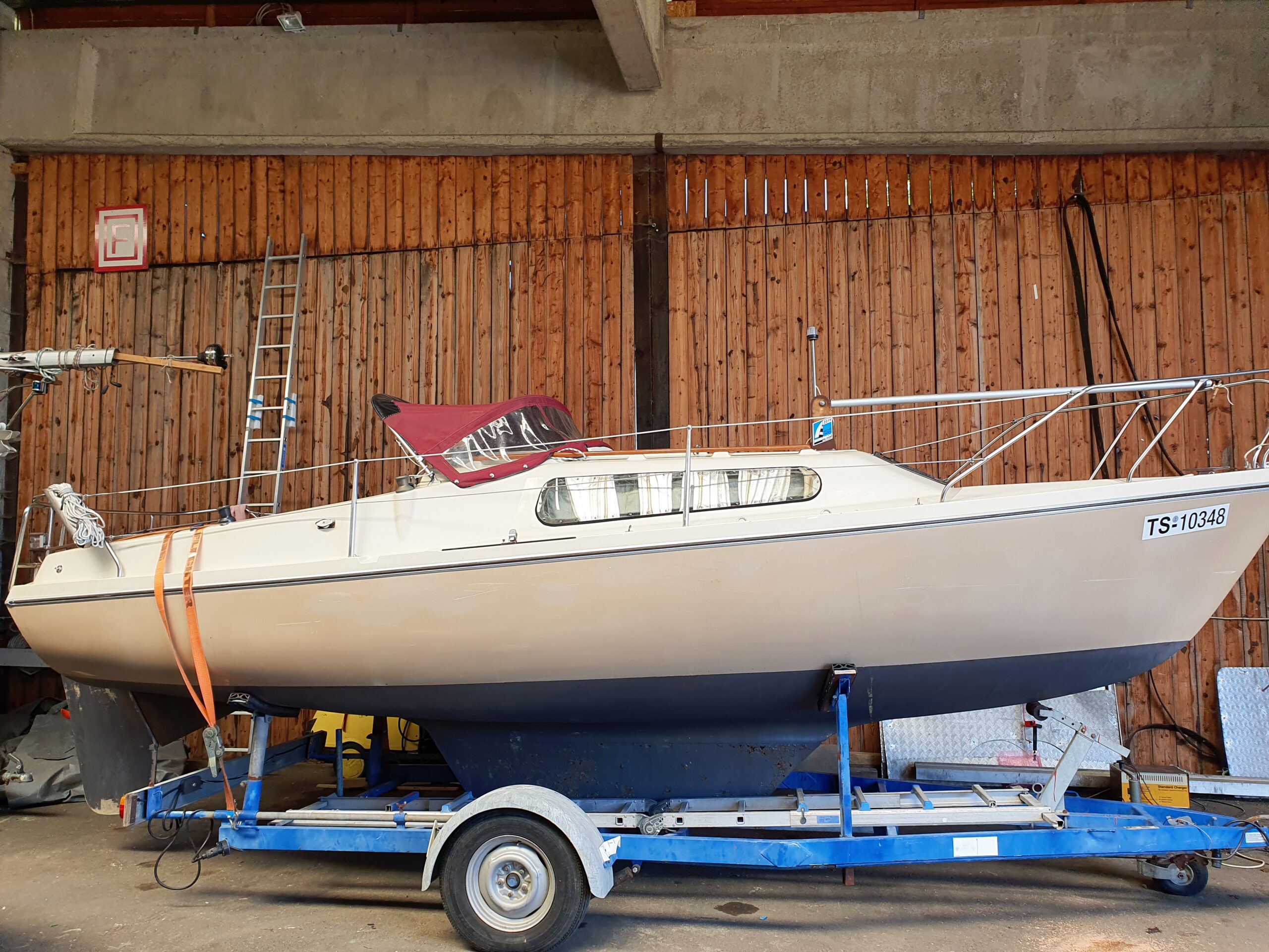 Fock, Genua, Sturm Fock, Spinnaker, Fockpersenning (Reißverschluss), Großsegelpersenning, original Varianta Geschirr, Leinen, diverses Zubehör (Bootshaken, Kühlgerät, Ruder), Badeleiter, Anker, inkl. Straßentrailer